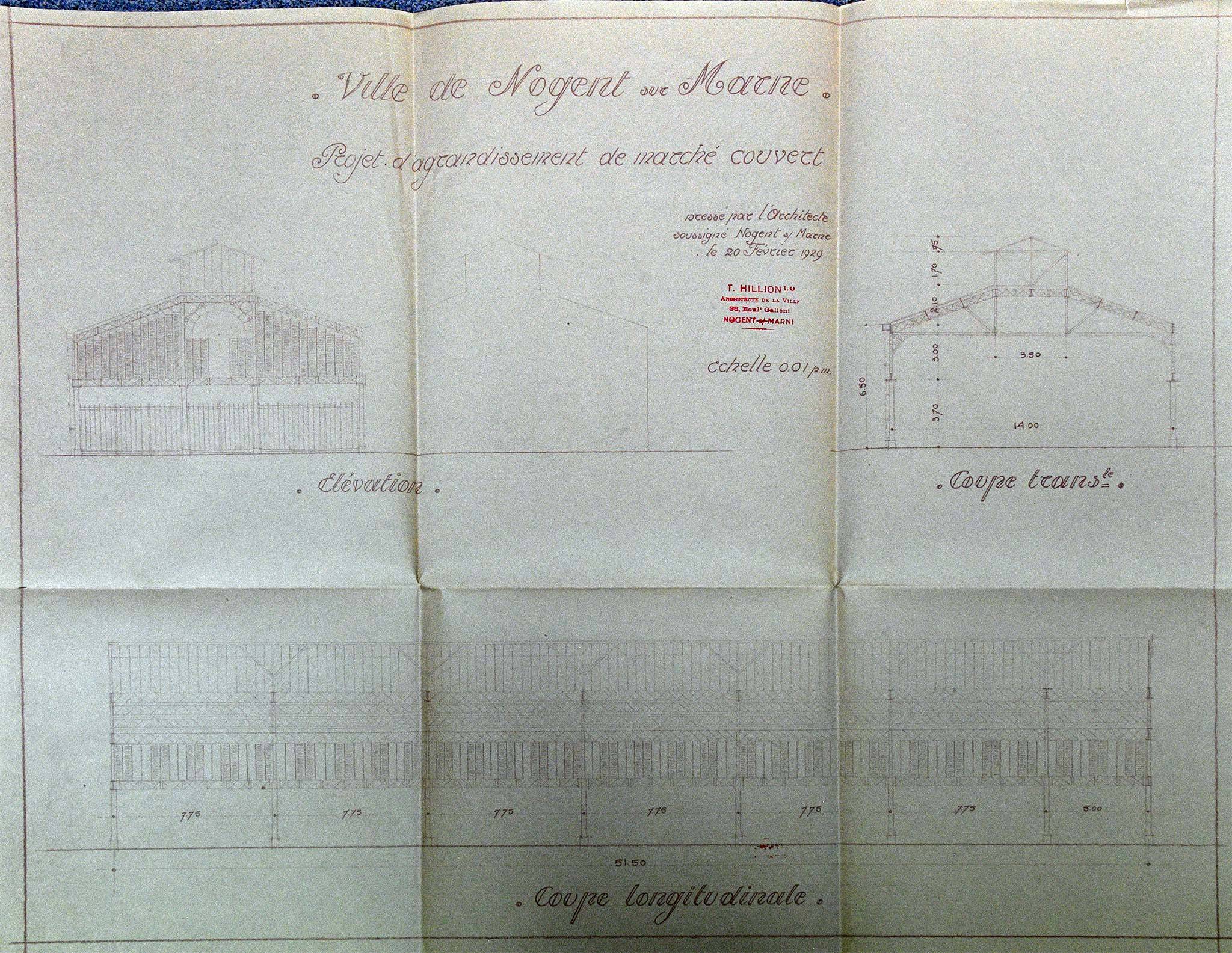 16, bd Gallieni Architecte Toussaint Hillion. ![]() Plan de la halle du marché contruite sous la direction de Toussaint Hillion, alors architecte municipal. Le document est daté du 20 février 1929, mais la halle ne sera achevée qu'en 1934.