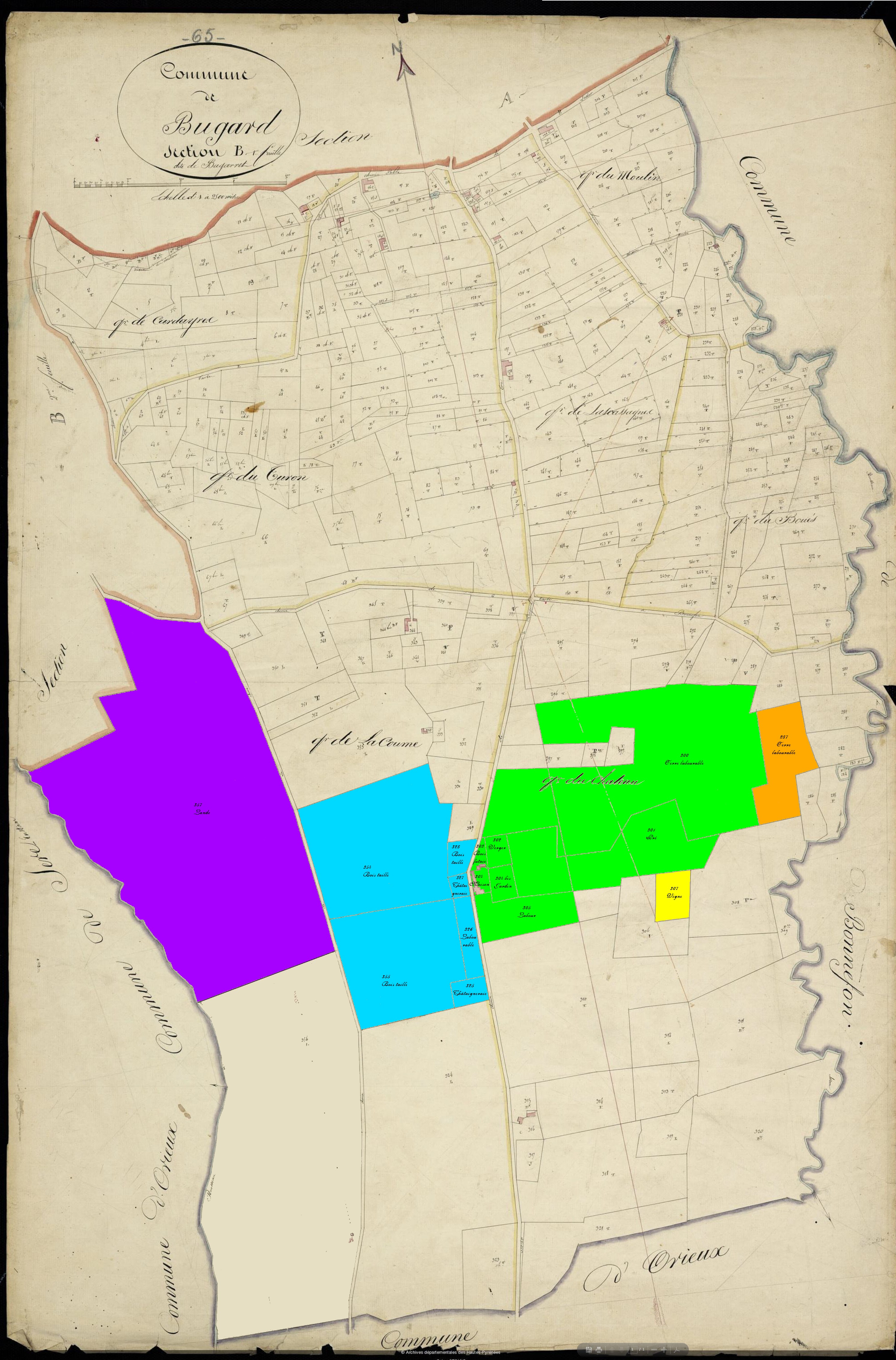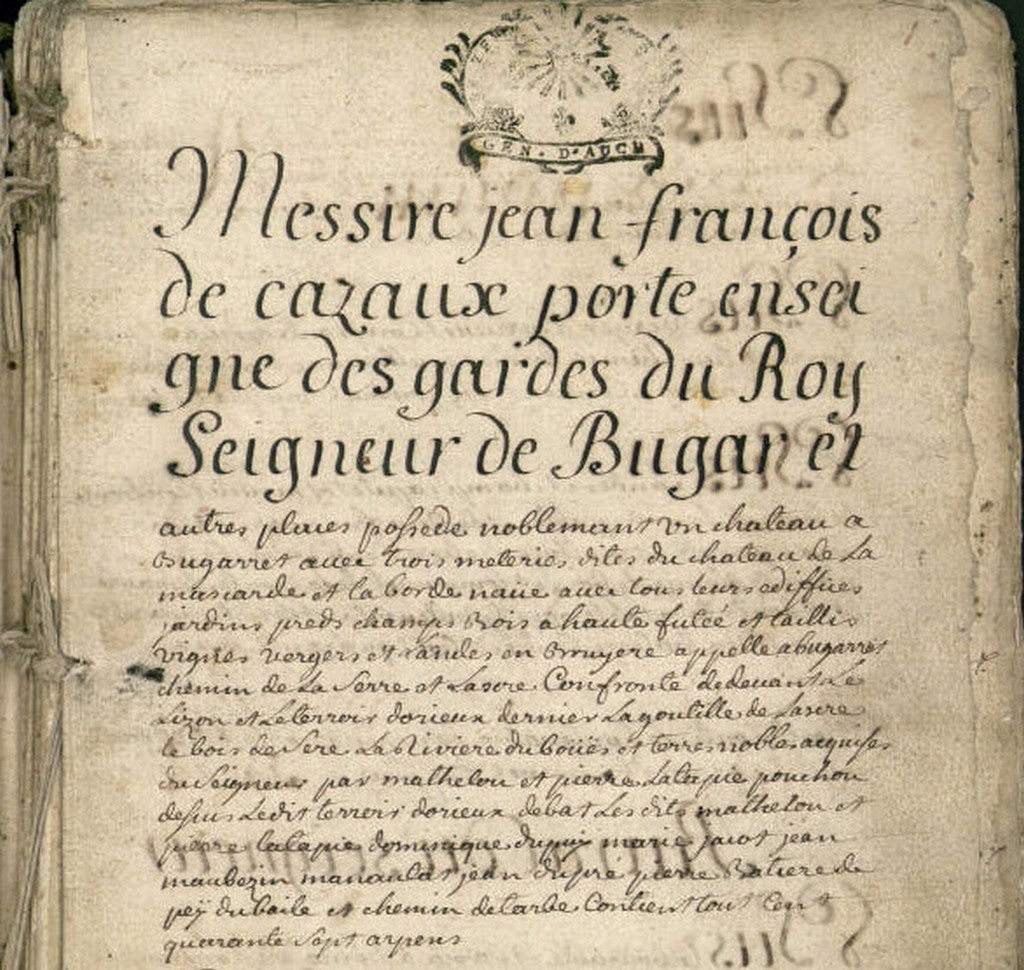 Cote Archives départementales 110 E DEPOT 2 Cote Archives communales CC 2 P 1 : Messire Jean François de Cazaux Seigneur de Bugard P 182 : Bernard Mailhe P 204 : Anne Lanes de Lagrange Les terriers de Bugard en 1738 et 1743 nous apprennent que le Seigneur de ce lieu était Messire Jean-François Cazaux, porte enseigne des gardes du Roy. 1743 - Suit la description du domaine de Bugarret avec ses trois métairies du château, de la Mascarde et de la Bordenave (cf carte de cassini). | |||||||||||||||||||||||||||||||||||||||||||||||||||||||||||||||||||||||||||||||||||
