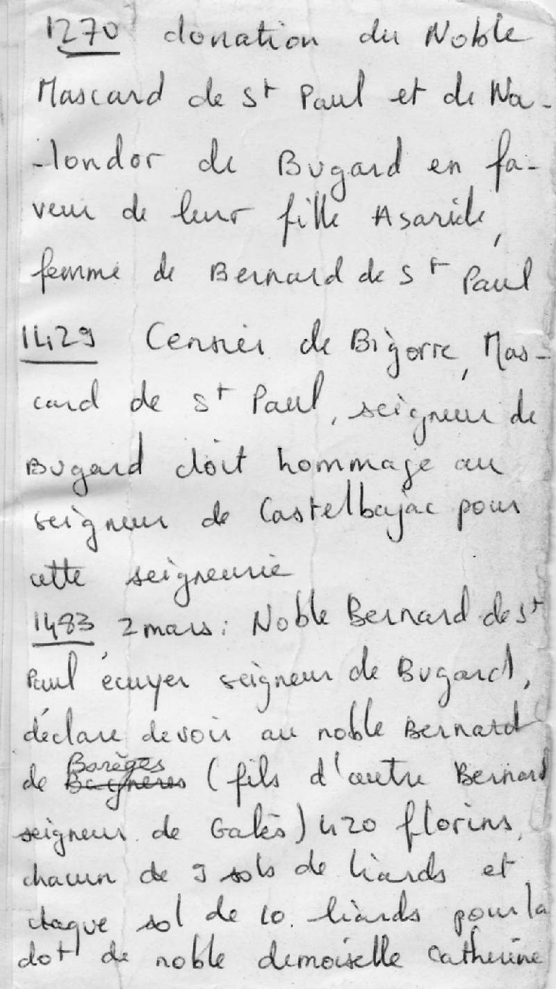 ----Je cite----- Nous possédons quelques documents mentionnant des seigneurs à Bugard: En 1197 le seigneur est Oddo de Bugart, qui a un fils Arnaud (2); Au début du XIIIème siècle un Galinus de Bugar donne une terre de « Ganelo « à l'abbaye de Berdoues pour 25 sous morlans. (5). En 1313, le seigneur est Arnaldus Guillermi de Bugarrio (3). En 1483 le seigneur est l'écuyer Bernard de Saint Paul (6). (1) Alcide Curie-Seimbres, BSR 1878, p.57 (2) J. Cazauran, le Cartulaire de Berdoues, op. cit., p.388 acte 568, de 1197 (3) DRN de 1313, ADHP 1MI2, et Maurice Berthe, op. cit., p.128 (4) Perrin-Font-reaulx, Les pouillés..., p.463, dans l'archiprêtré de Luby. La paroisse est alors déserte. (5) J. Cazauran, idem, p.401 acte 582 (6) Larcher, Glanages, T.VII p.88 ----Fin de citation----- | |||||||||||||||||||||||||||||||||||||||||||||||||||||||||||||||||||||||||||||||||||
