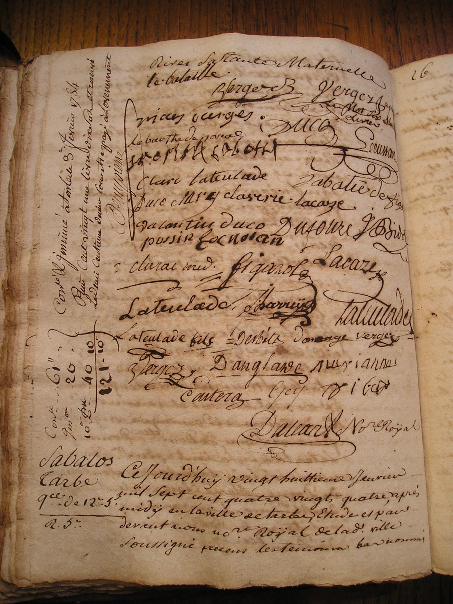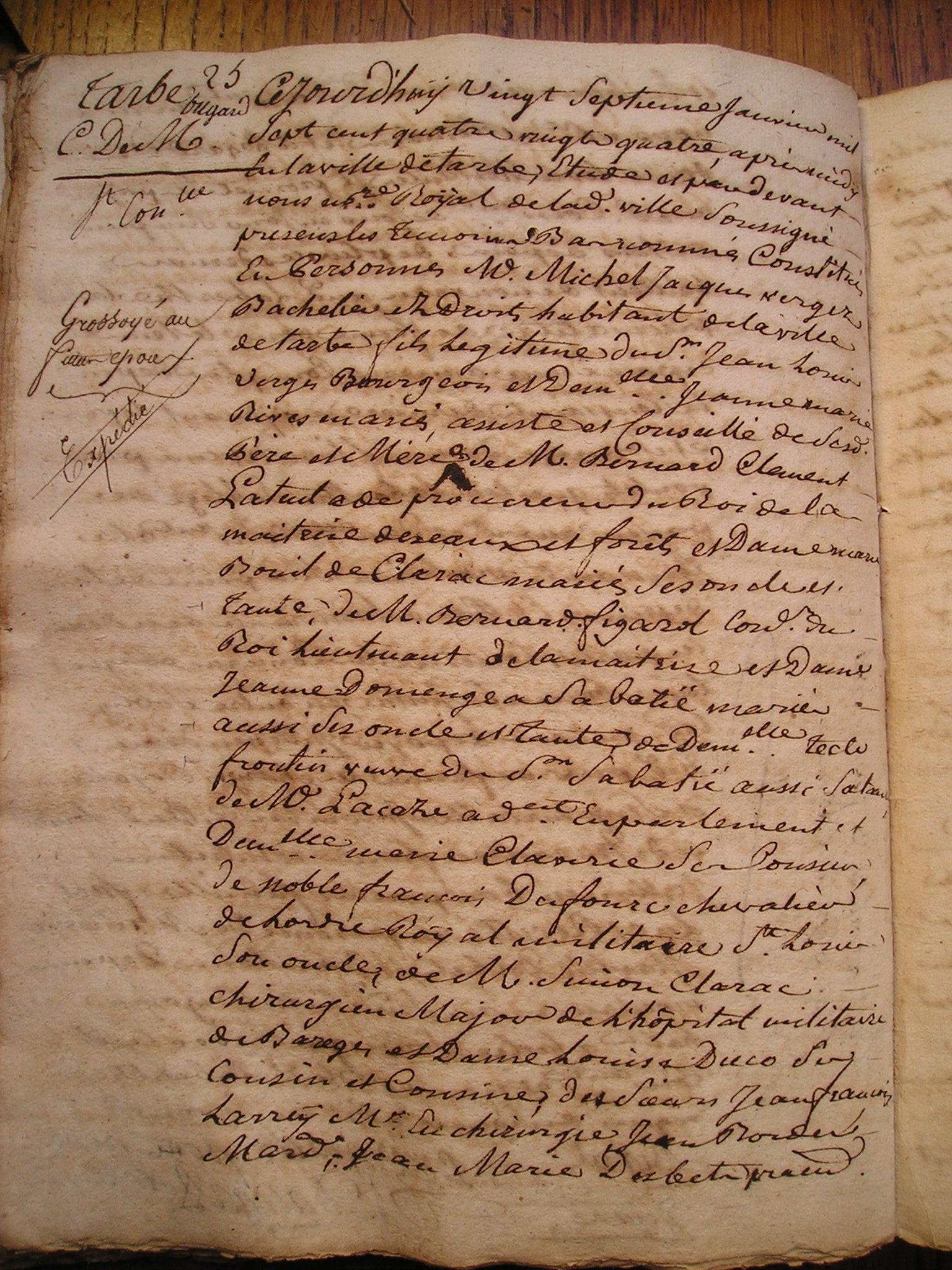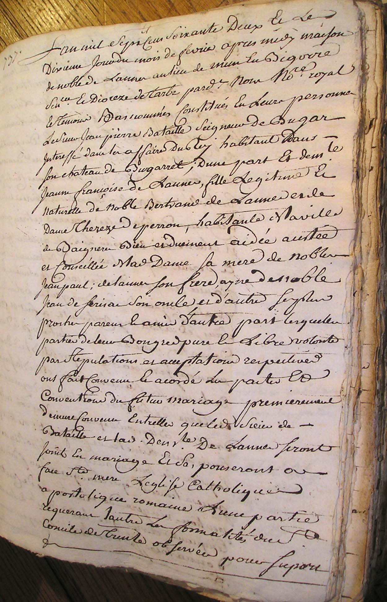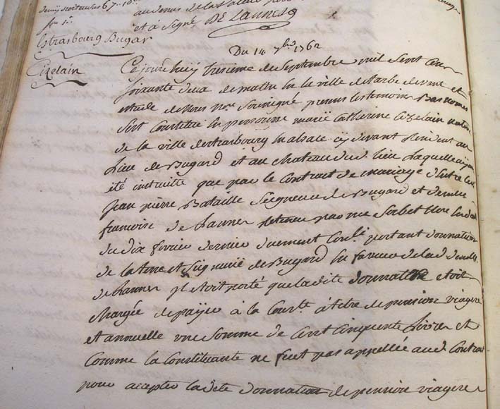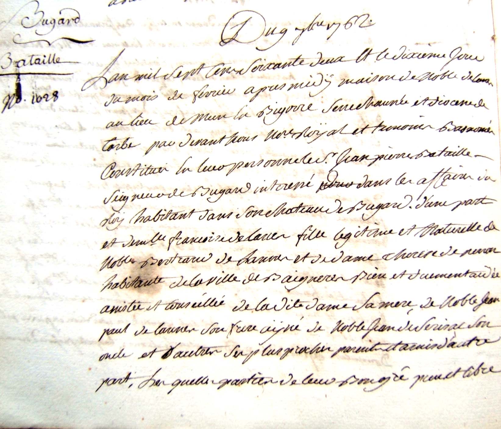 1. Ce jourd'huy trezieme jour de septembre mil sept cent 2. soixante deux de matin en la ville de Tarbe devant et 3. etude de nous notaire soussigné presens les temoins bas només 4. S'est constitué en personne Marie Catherine Cizelain native 5. de la ville de Strasbourg en Alsace cy devant residant au 6. lieu de Bugard et au château dudit lieu Laquelle ayant 7. été instruite que par le contract de mariage d'entre Sr 8. Jean Pierre Bataille Seigneur de Bugard et Demlle 9. Francoise de Lannes retenu par Me Sorbet notaire en date 10. du dix fevrier dernier duement controlé portant donnation 11. de la terre et Seigneurie de Bugard en faveur de ladite Demlle 12. de Lannes Il etoit porté que ladite donnataire etoit 13. chargée de payer a la constituante à titre de pension viagere 14. et annuelle une somme de cent cinquante livres et 15. comme la constituante ne fust pas appellée audit contrat 16. pour accepter ladite donnation de pension viagere |