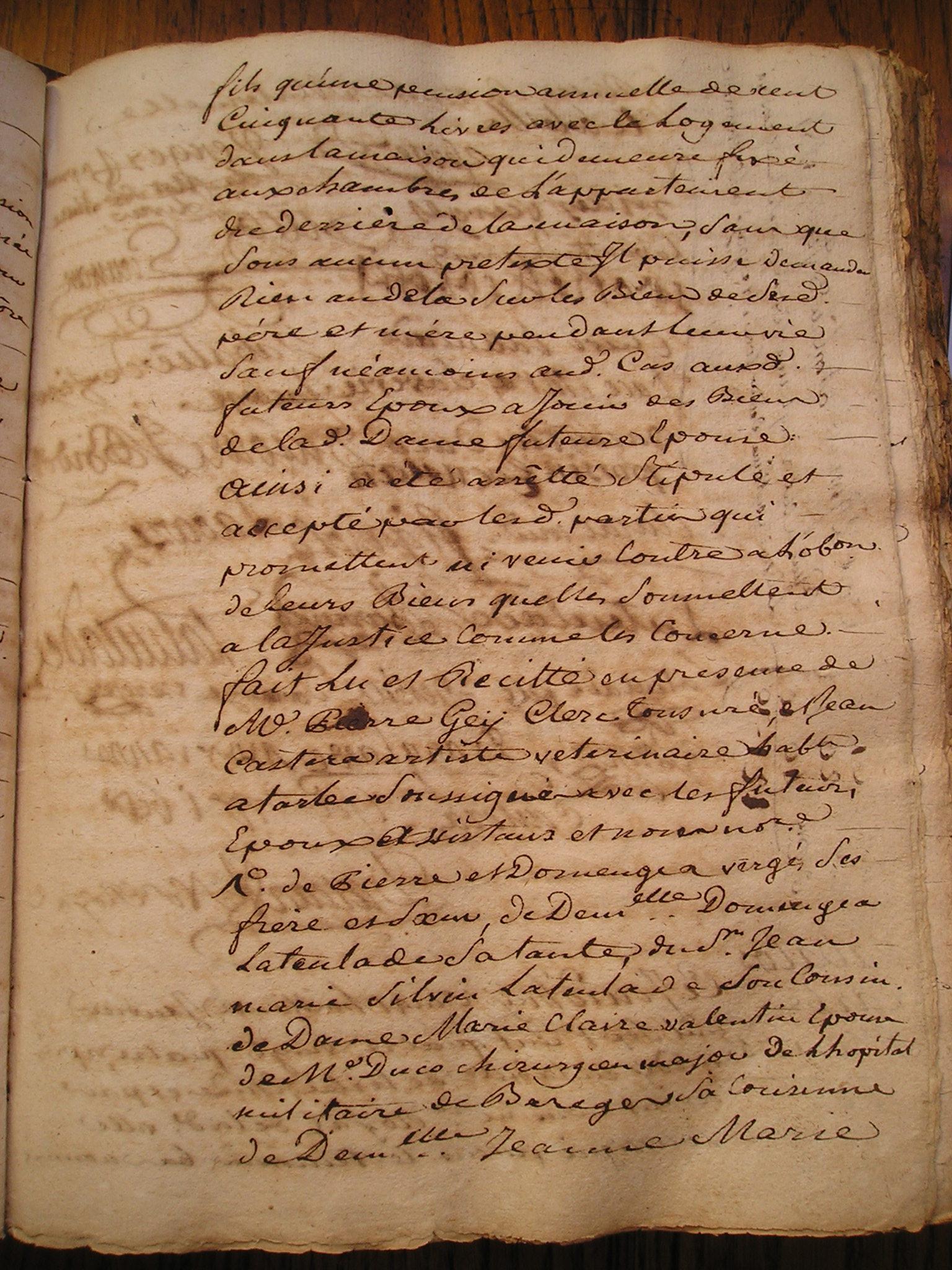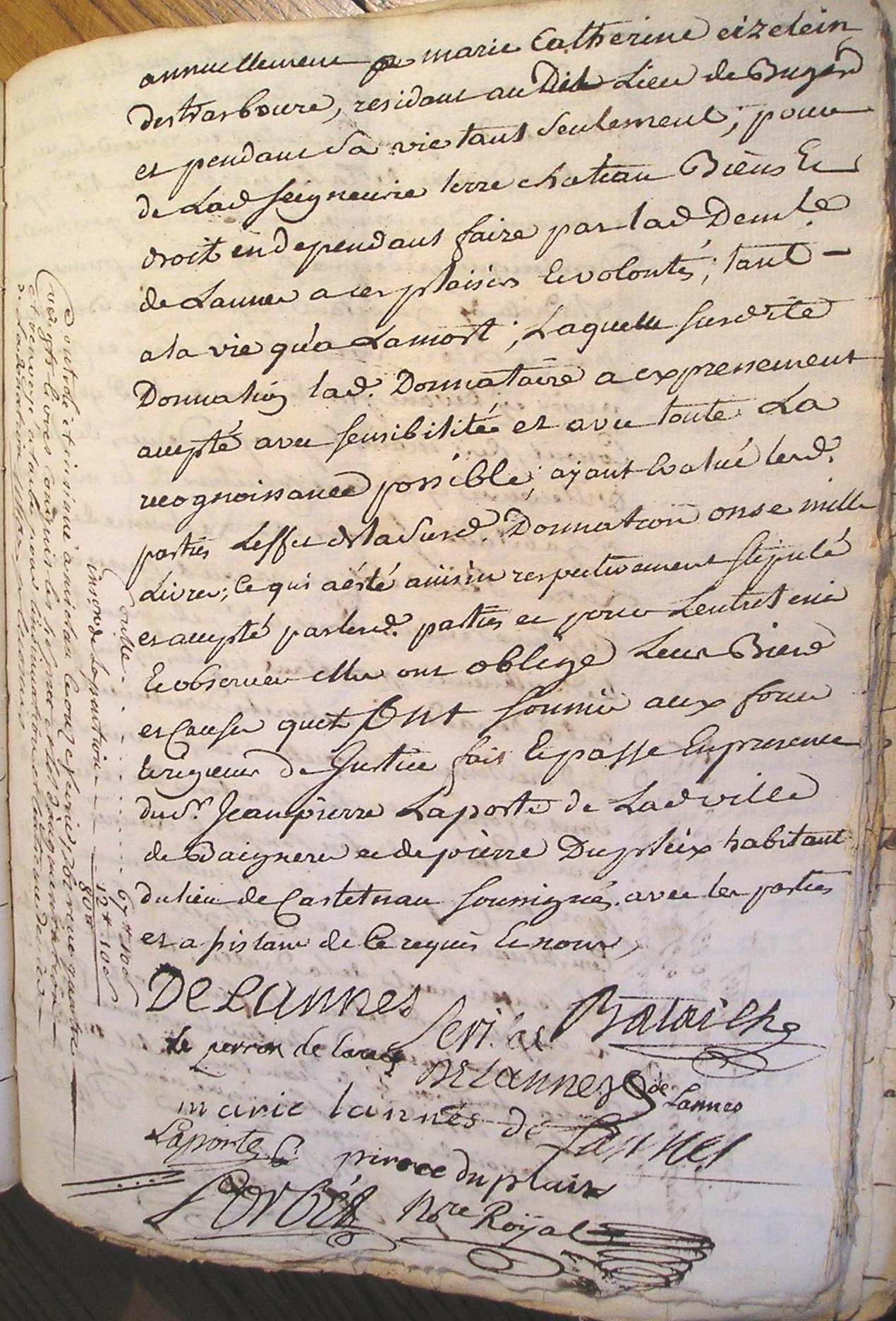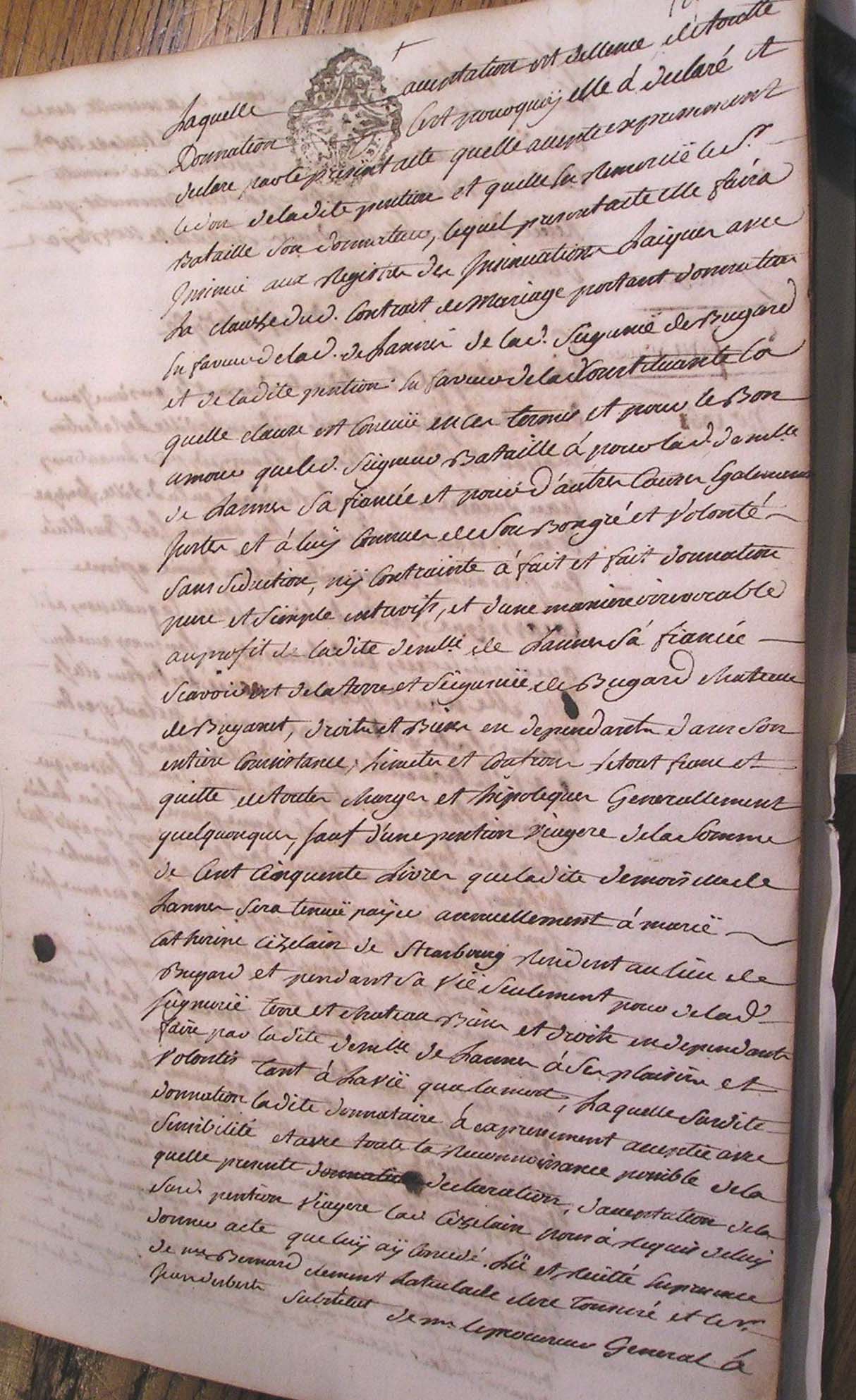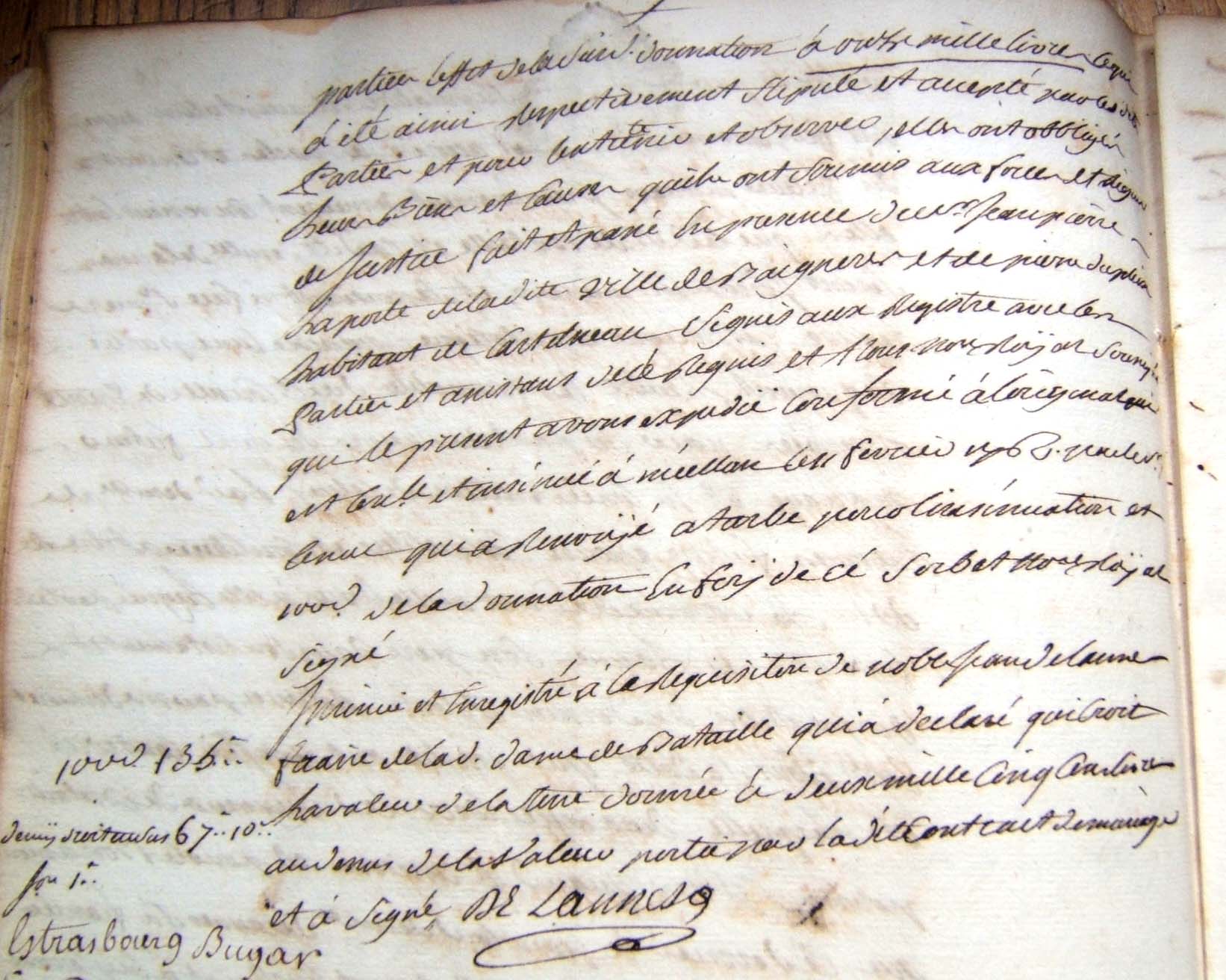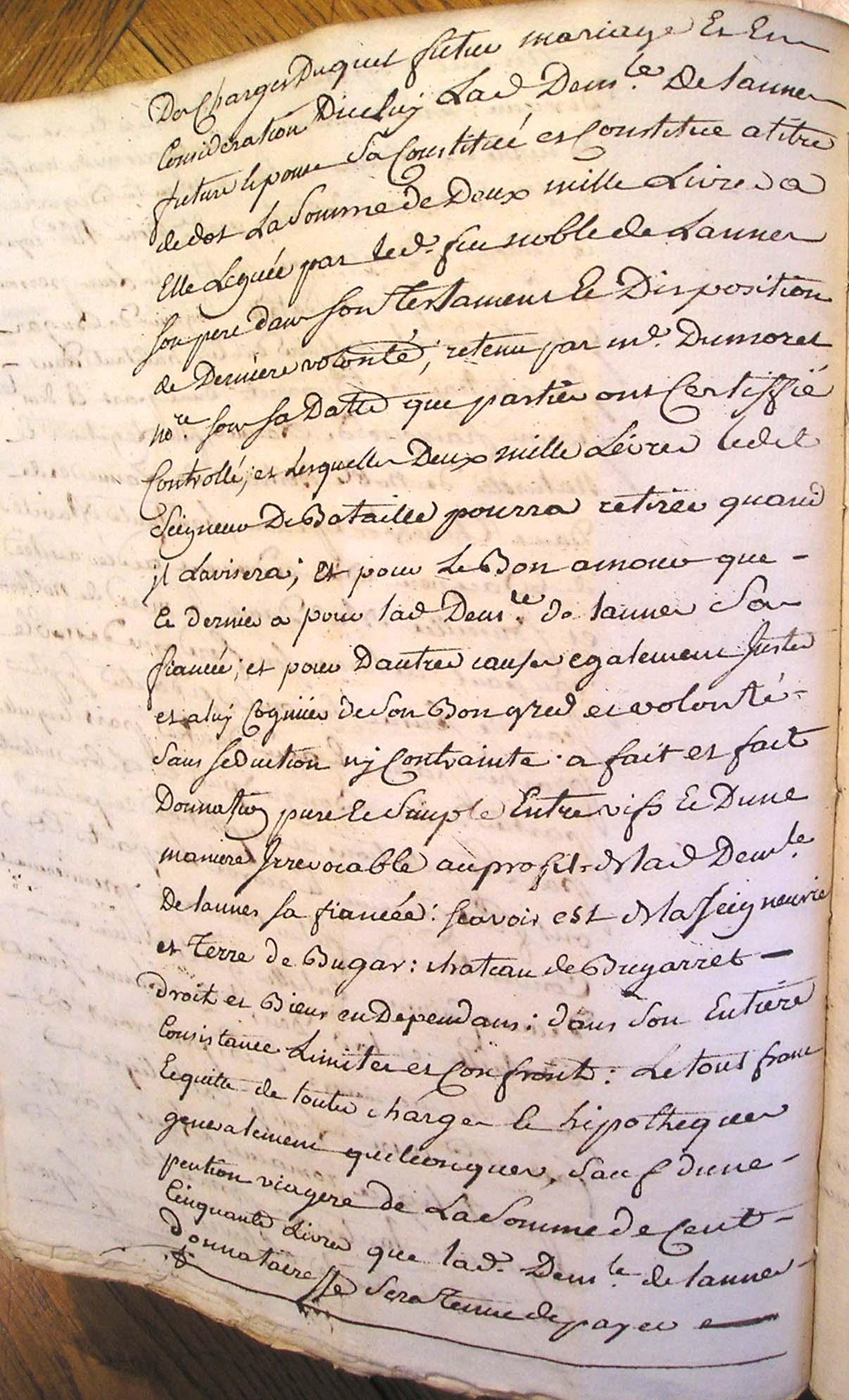 17. Laquelle acceptation est d'essence de toutte 18. donnation C'est pourquoy elle a declaré et 19. declare par le present acte qu'elle accepte expressement 20. le don de ladite pention et qu'elle en remercie le Sr 21. Bataille son donnateur, lequel present acte elle faira 22. insinuer au registre des insinuations laïques avec 23. la clause dudit contrat de mariage portant donnation 24. en faveur de ladite de Lannes de ladite Seigneurie de Bugard 25. et de ladite pention en faveur de ladite constituante La 26. quelle clause et connue en ces termes : et pour le bon 27. amour que ledit Seigneur Bataille a pour ladite Demlle 28. de Lannes sa fiancée et pour d'autres cauzes egalement 29. justes et a luy connues de son bon gré et volonté 30. sans seduction ny contrainte a fait et fait donnation 31. pure et simple entre vifs, et d'une maniere irrevocable 32. au profit de ladite Demlle de Lannes sa fiancée 33. Scavoir est de la terre et Seigneurie de Bugard château 34. de Bugart, droits et biens en dependants dans son 35. entiere consistance, limites et confrons, le tout franc et 36. quitte de toutes charges et hipoteques generallement 37. quelconques, sauf d'une pention viagere de la somme 38. de cent cinquante livres que ladite demoiselle de 39. Lannes sera tenue payer annuellement à Marie 40. Catherine Cizelain de Strasbourg resident au lieu de 41. Bugard et pendant sa vie seulement pour de ladite 42. Seigneurie terre et château biens et droits en dependants 43. faire par la dite Demlle de Lannes à ses plaisirs et 44. volontés tant à la vie qu'à la mort, Laquelle surdite 45. donnation ladite donnataire a expressement acceptée avec 46. sensibilité et avec toute la reconnoissance possible. de la 47. quelle presente declaration d'acceptation de la 48. surdite pention viagere ladite Cizelain nous a requis de luy 49. donner acte que luy ai concedé. Lü et recité en presence 50. de Me Bernard demeurant Latuslade clerc tonsuré et Sr 51. Jean derbert substitut de Mr le procureur general à |