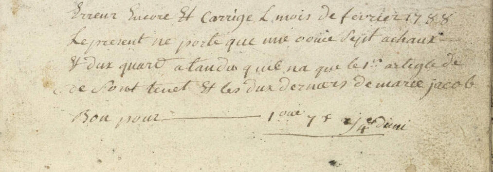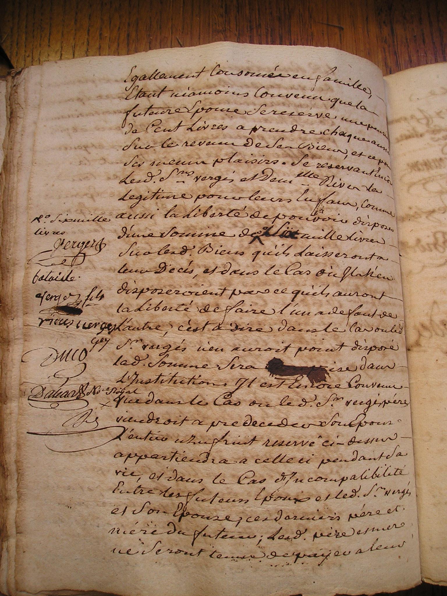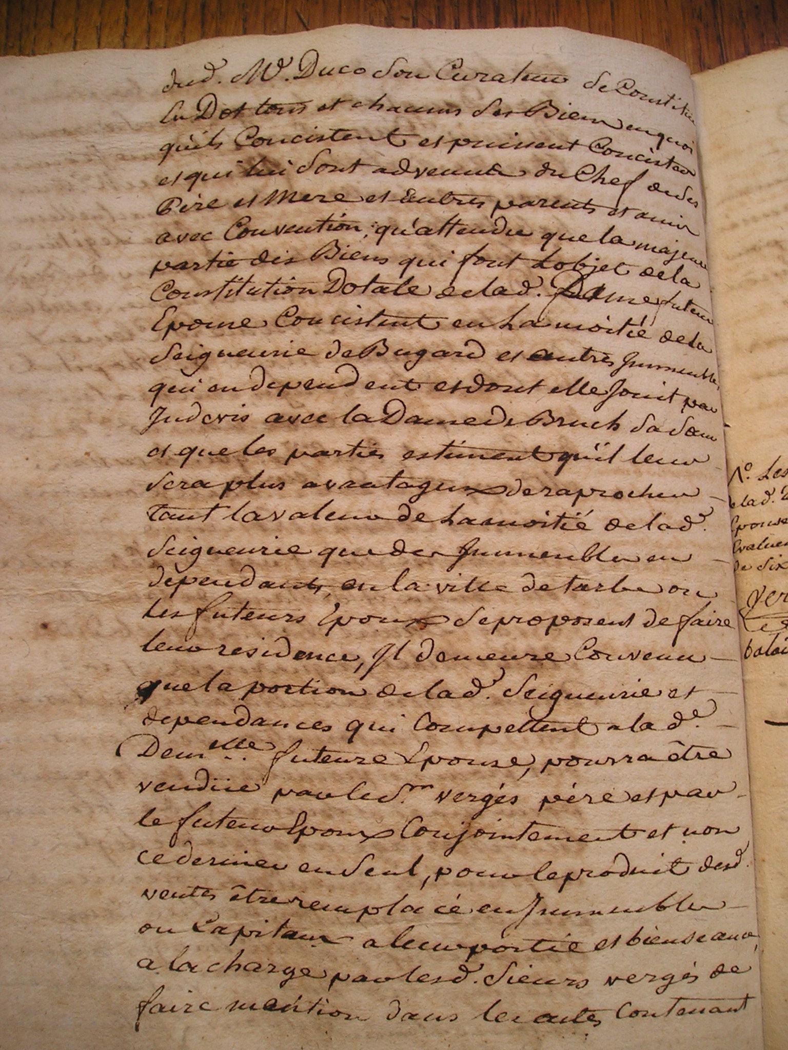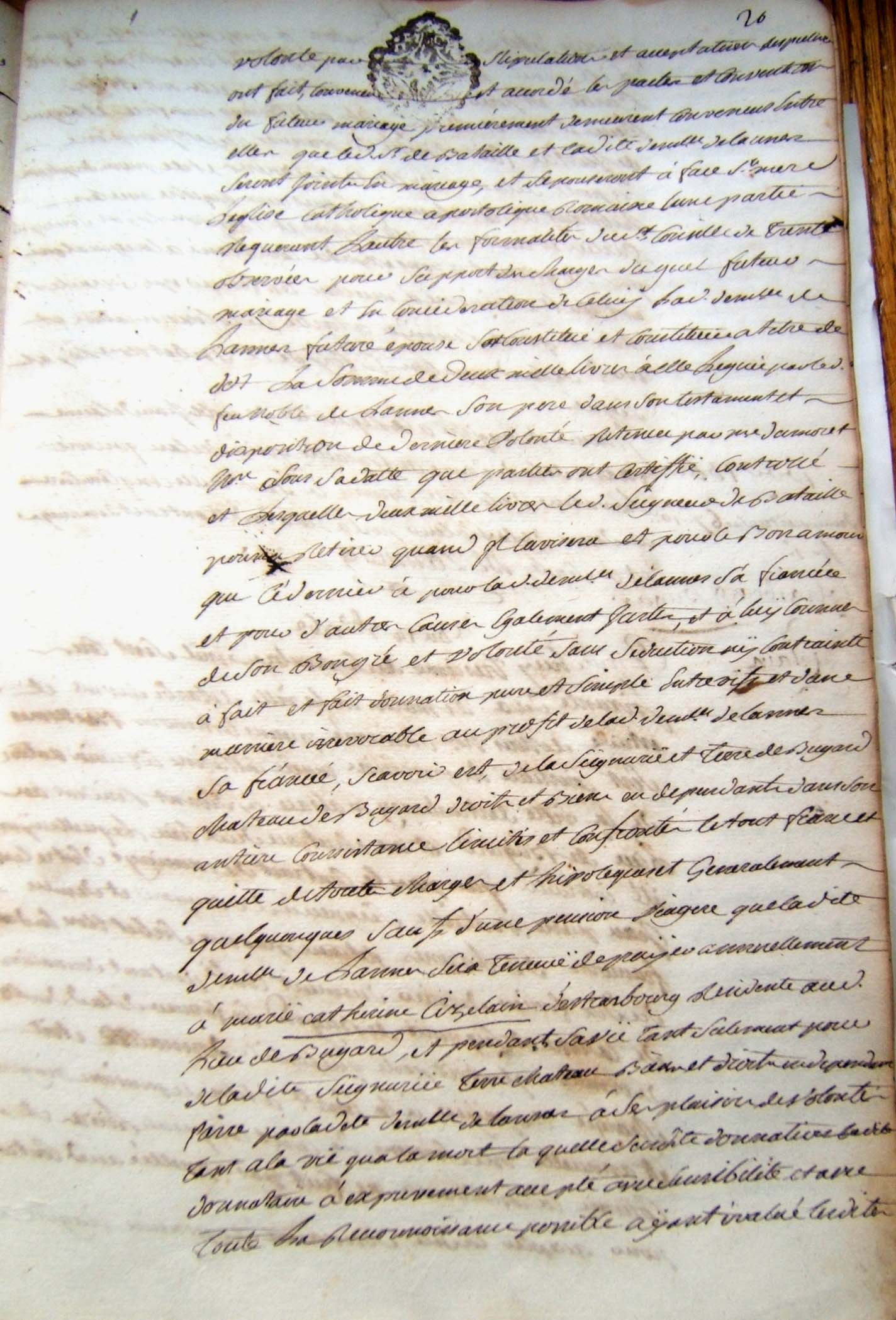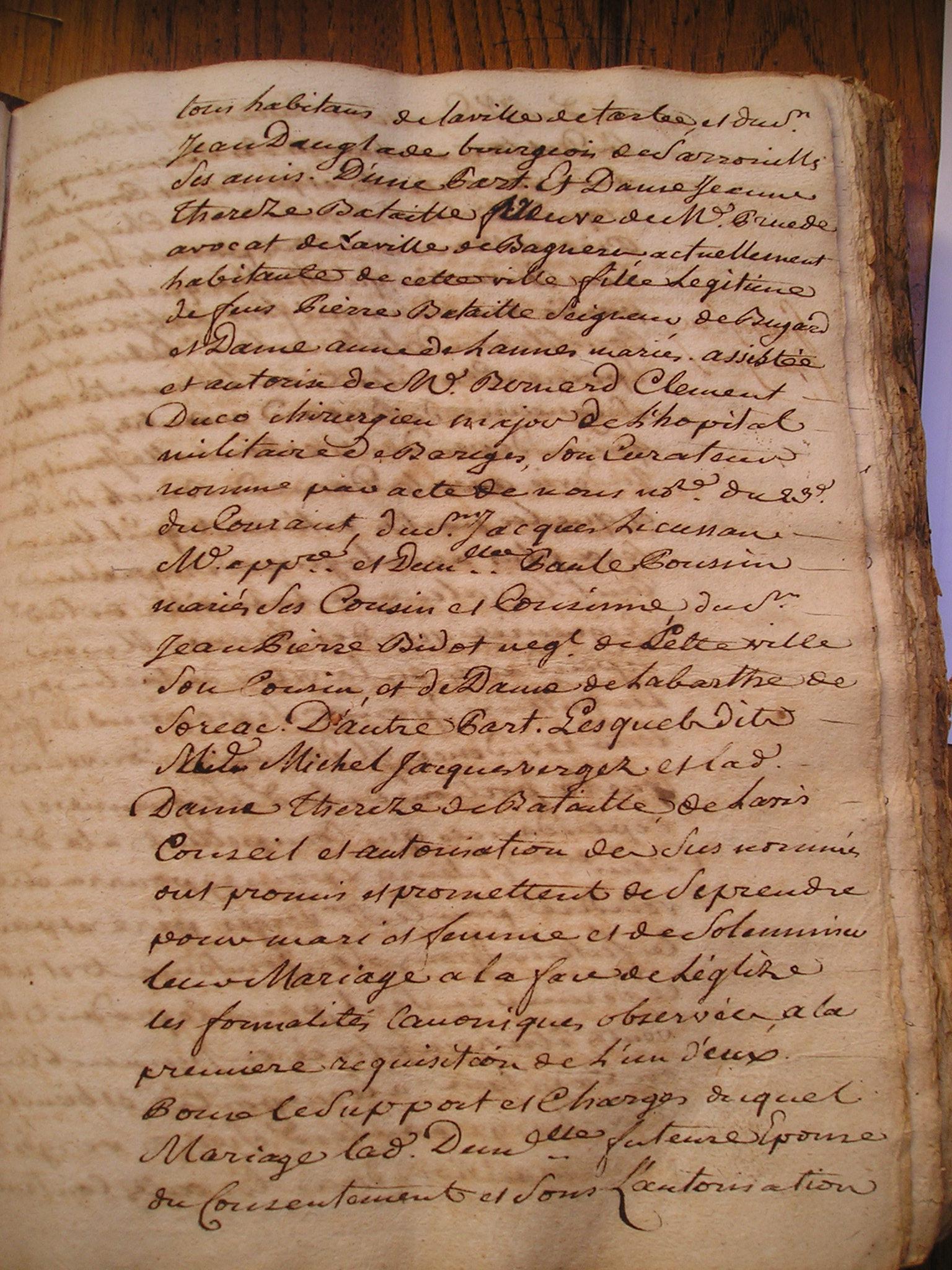 17. Laquelle acceptation est d'essence de toutte 18. donnation C'est pourquoy elle a declaré et 19. declare par le present acte qu'elle accepte expressement 20. le don de ladite pention et qu'elle en remercie le Sr 21. Bataille son donnateur, lequel present acte elle faira 22. insinuer au registre des insinuations laïques avec 23. la clause dudit contrat de mariage portant donnation 24. en faveur de ladite de Lannes de ladite Seigneurie de Bugard 25. et de ladite pention en faveur de ladite constituante La 26. quelle clause et connue en ces termes : et pour le bon 27. amour que ledit Seigneur Bataille a pour ladite Demlle 28. de Lannes sa fiancée et pour d'autres cauzes egalement 29. justes et a luy connues de son bon gré et volonté 30. sans seduction ny contrainte a fait et fait donnation 31. pure et simple entre vifs, et d'une maniere irrevocable 32. au profit de ladite Demlle de Lannes sa fiancée 33. Scavoir est de la terre et Seigneurie de Bugard château 34. de Bugart, droits et biens en dependants dans son 35. entiere consistance, limites et confrons, le tout franc et 36. quitte de toutes charges et hipoteques generallement 37. quelconques, sauf d'une pention viagere de la somme 38. de cent cinquante livres que ladite demoiselle de 39. Lannes sera tenue payer annuellement à Marie 40. Catherine Cizelain de Strasbourg resident au lieu de 41. Bugard et pendant sa vie seulement pour de ladite 42. Seigneurie terre et château biens et droits en dependants 43. faire par la dite Demlle de Lannes à ses plaisirs et 44. volontés tant à la vie qu'à la mort, Laquelle surdite 45. donnation ladite donnataire a expressement acceptée avec 46. sensibilité et avec toute la reconnoissance possible. de la 47. quelle presente declaration d'acceptation de la 48. surdite pention viagere ladite Cizelain nous a requis de luy 49. donner acte que luy ai concedé. Lü et recité en presence 50. de Me Bernard demeurant Latuslade clerc tonsuré et Sr 51. Jean derbert substitut de Mr le procureur general à |