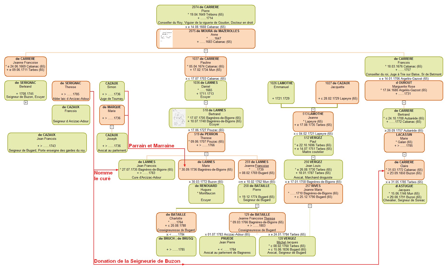 Les terriers de Bugard (Cote Archives départementales.: 110 E DEPOT 1 & 2) nous ont montré qu'en 1738 et 1743, Messire Jean François de Cazaux, porte enseigne des gardes du Roy, était Seigneur de Bugard. En 1762 le contrat de mariage entre Pierre de BATAILLE et Françoise de LANNES montre que celui ci était devenu Seigneur de Bugard. Thérèse de SERIGNAC, abbé laic d'Arcizac-Adour nomme Jean François de LANNES, son cousin, Curé d'Arcizac-Adour. Celui ci prend possession de la cure le 26 04 1774 (Maitre DASTES Notaire), c'est le frère Françoise de Lannes. Le livre Châteaux, maisons nobles des Hautes Pyrénées nous apprend que c'est dans le château de Buzon qu'à demeuré pendant plusieurs siècles la famille de Sérinhac ou Sérignac. Branche éteinte depuis 1787. Par suite d'une donation du 24.02.1785, la seigneurie de Buzon qui appartenait à noble dame Thérèse de SERIGNAC, veuve de noble François de CAZAUX, dernière survivante, est devenue propriété de noble Claire de CARRERE, sa petite nièce, qui épousera Jacques DASTUGUE. Thérèse de SERIGNAC semble donc apparentée au couple Bertrand de SERIGNAC, Seigneur de Buzon, x Jeanne Françoise de CARRERE, mais je 'ai actuellement pas le lien. Le 30 septembre 1736, Marie de LANNES, soeur de Françoise et Jean François est baptisée. Ses parraine et marraine sont Simon CAZAUX, juge de Tournai et Marie de MARQUE mariés. Thèrèse de Bataille fille de Pierre de BATAILLE épouse Michel Jacques VERGEZ le 20 janvier 1784 à Tarbes. Il est fils de Jean Louis VERGEZ x (le 17/01/1758 à Bagnères) Jeanne Marie RIVES fils de Paul Vergez x (le 04/02/1721 à Lapeyre) Jeanne Lamothe Jeanne est la fille d'Emmanuel Lamothe et Jacquette de CAZAUX (+28/02/1729 à Lapeyre) ![]() de_cazaux_v2.jpg |