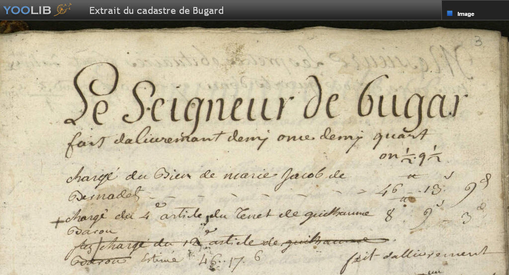 Cote Archives départementales.: 110 E DEPOT 1 Cote Archives communales......: CC 1 Vue 8 : Messire Jean François de Cazaux Seigneur de Bugar Vue 67 : Bernard Mailhe Vue 71 : Anne Lanes de Lagrange Bernard Mailhe pourrait être apparenté à Dominique Maille, agent en 1757 de Pierre de Bataille Anne Lanes de Lagrange... Pas de parenté connue. | |||||||||||||||||||||||||||||||||||||||||||||||||||||||||||||||||||||||||||||||||||