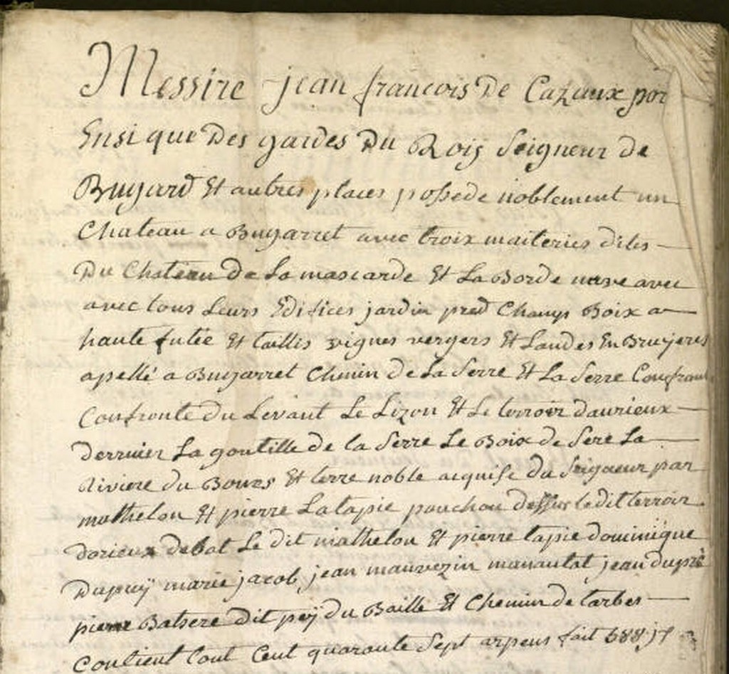 Cote Archives départementales.: 327 E DEPOT 2 Cote Archives communales......: CC 1 Messire Jean François de CASAUS seigneur de Bugard et autres places H[abit]ant du lieu de Nestier tient et possède un château, ... | |||||||||||||||||||||||||||||||||||||||||||||||||||||||||||||||||||||||||||||||||||
