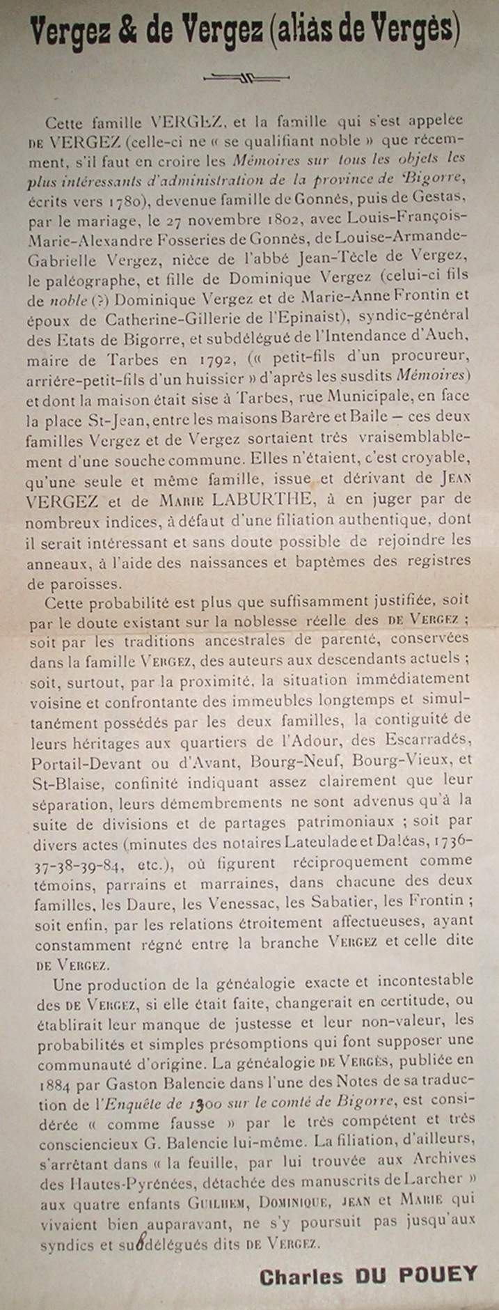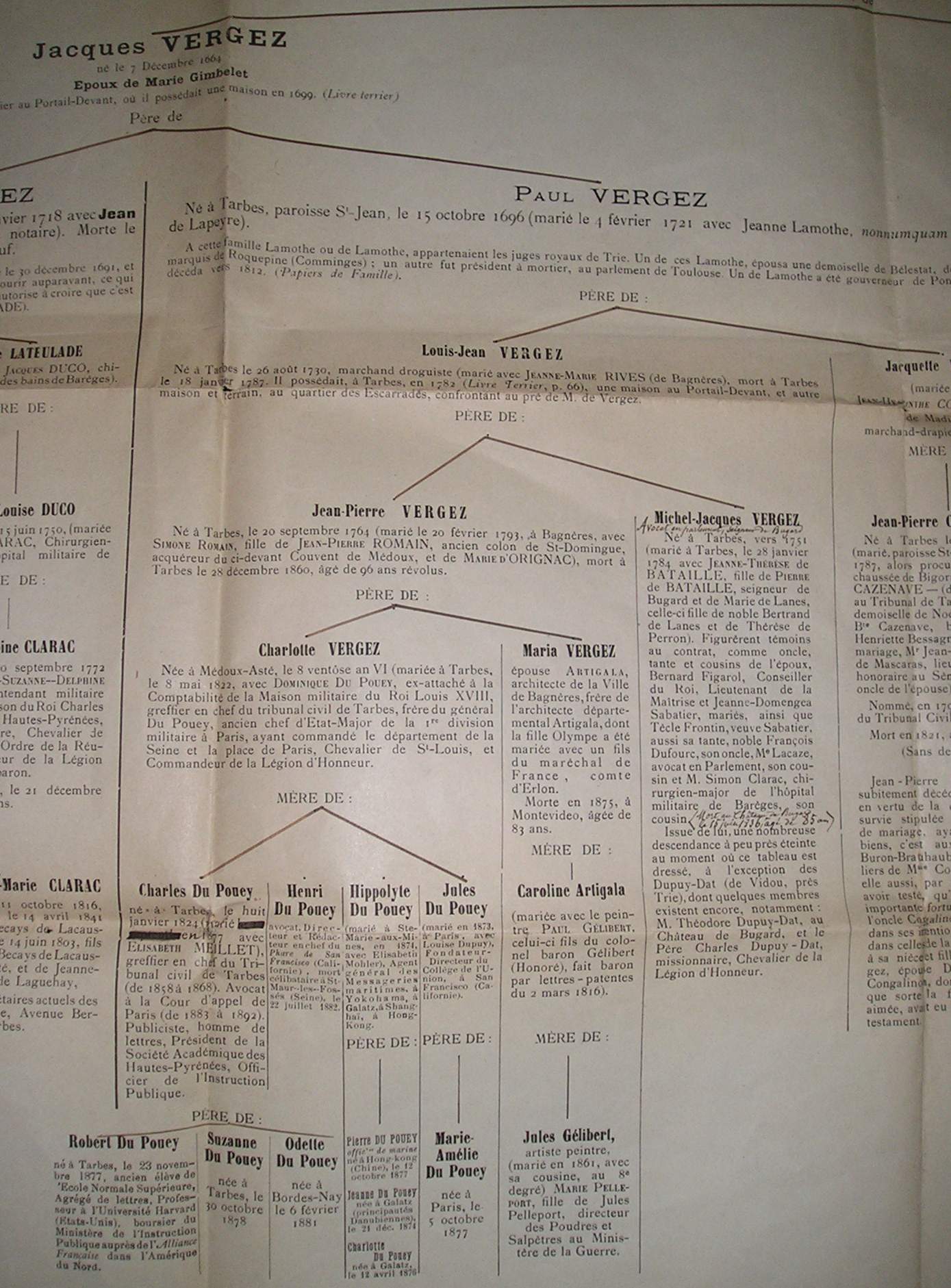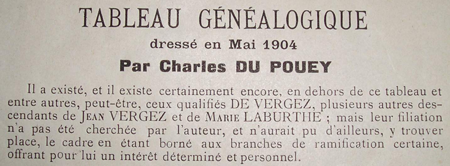 | Arbre généalogique datant de 1904 réalisé par Charles Du Pouey (AM Tarbes, série S) | |||