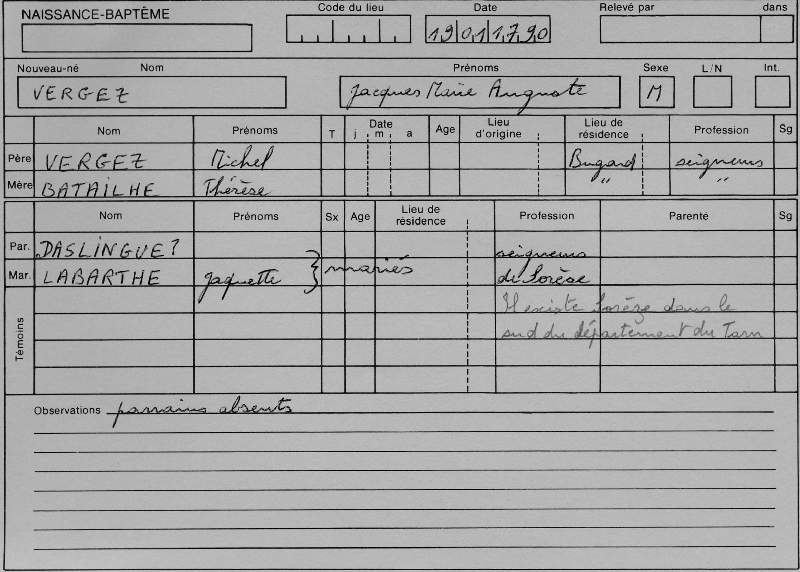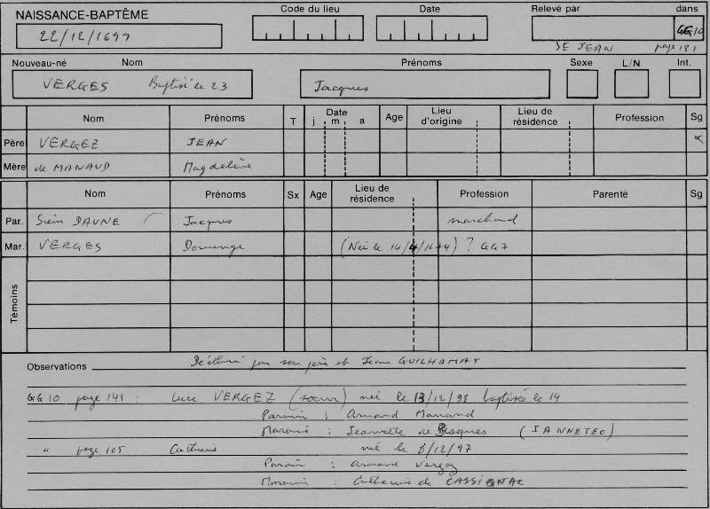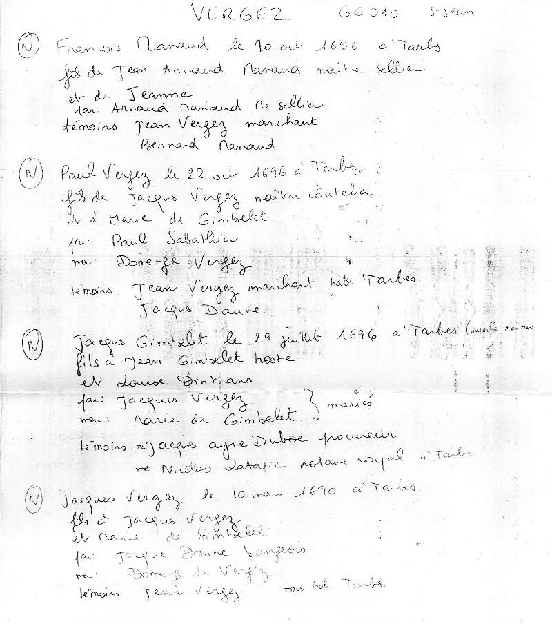 Sans aucune opposition ni empèchement entre le Sieur Jean Louis Vergez Marchand Droguiste fils de feu Paul Vergez et de demoiselle Jeanne Lamothe de la paroisse de Saint Jean de Tarbes d'une part et de demoiselle Jeanne Marie Rives fille de feu Dominique Rives marchand et demoiselle Marie de Nogues de la présente paroisse d'autre part d'autre part la dispense des autres deux bans ayant été obtenues de Monseigneur l'évèque en date du 13e janvier [et étant ?] insinuées le même jour. Née d'ailleurs le certificat de de Messire Darmagnac curé de Saint Jean en date du jour d'hier portant consentement de ses parents. La bénédiction nuptiale leur a été dispensée par moy soussigné du consentement de [sir Lan... ...] de Bagnères en présence de messire Michel Grasset Seigneur d'Orignac, messire Paul Fourcade prêtre [...] et de messire Bernard Clément Lateulade avocat en parlement et de sieur Hyacinthe Congalinon marchand les deux derniers habitant Tarbes qui ont tous signé avec moy de même que l'époux et l'épouse. |