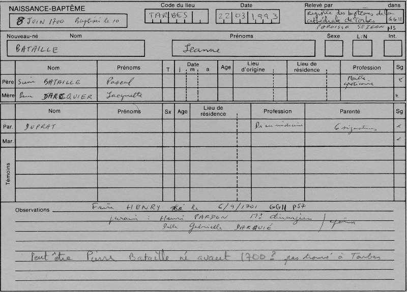 Lu sur GenHP65 le 08/02/2006 Les Archives Départementales des Hautes-Pyrénées ne sont pas les championnes de la numérisation... pour l'instant, seules quelques cartes postales ont été numérisées. Les RP et l'Etat civil sont seulement micro-filmés. Mais peut-être que les choses vont évoluer car un nouveau Directeur des AD65 vient d'entrer en poste. Quant aux Archives Municipales de Tarbes, quatre fonds sont numérisés : les délibérations du conseil municipal, les RP et l'Etat civil, le cadastre napoléonien et le recensement quinquennal de la population de Tarbes en 1856 (le premier d'une longue série); toutes ces images numériques sont consultables sur place, au service des AM, situé au 1er étage de la médiathèque Louis Aragon, 31 rue André Fourcade. Un projet de mise en ligne de tous ces documents est à l'étude. Source S.B. |